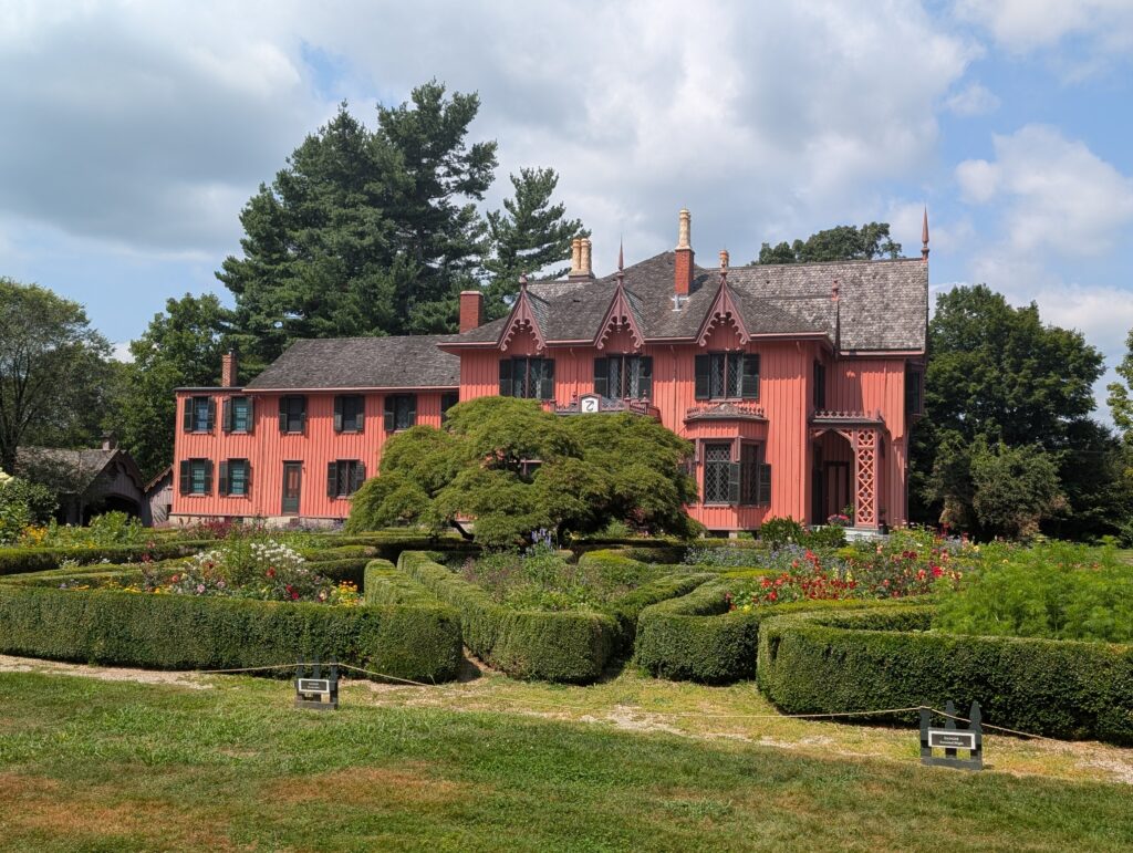 Roseland Cottage, located in charming Woodstock, Connecticut is also known as the “Pink House.” More like salmon color to me but the current color is apparently one of 14 shades used since it was constructed.